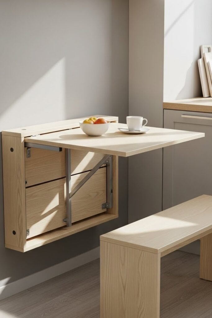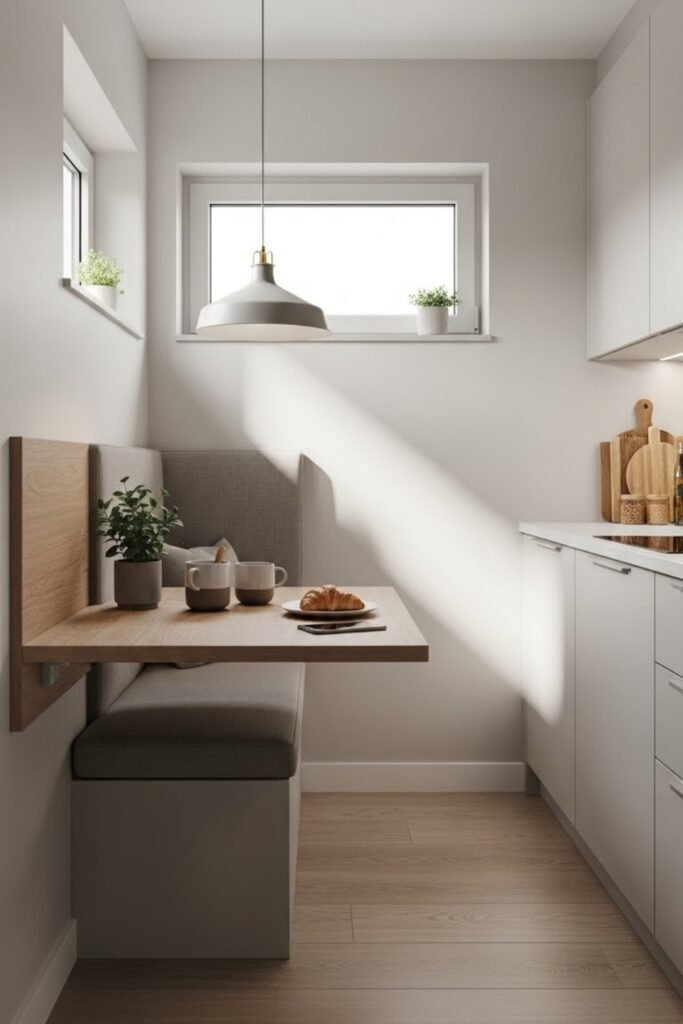 Install a wall-mounted table paired with a built-in bench to create a compact breakfast nook. This DIY setup takes up minimal floor space and works well in small kitchens.