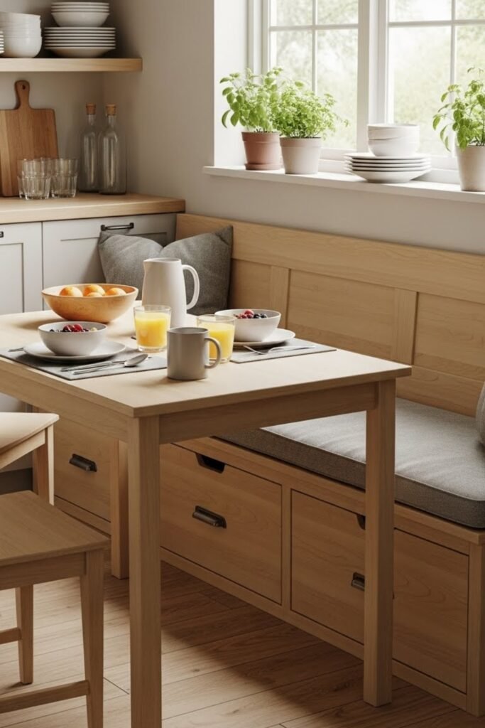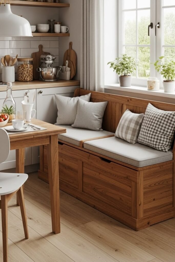 Create a breakfast nook by building a bench directly under a window. Natural light makes the space feel warm and inviting, perfect for morning meals.