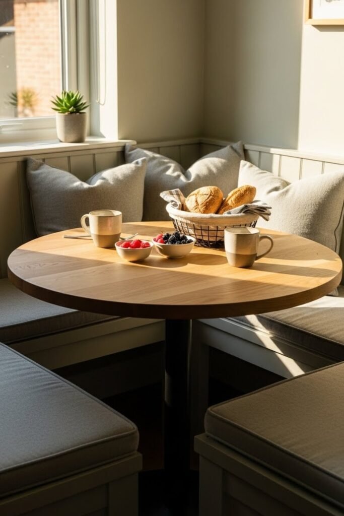 Use a small round table with built-in or freestanding benches to create a cozy breakfast nook. The curved shape makes movement easier in tight spaces and encourages conversation.
