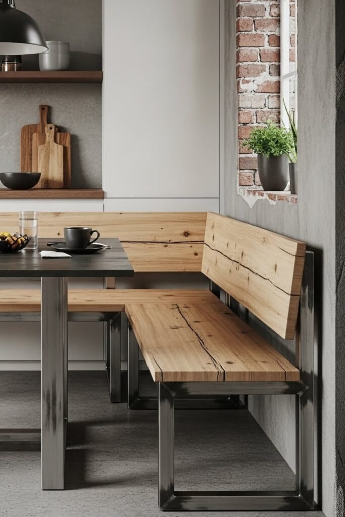 Build a breakfast nook using metal frames combined with wood seating for an industrial look. Pipe legs or steel brackets add strength and character.