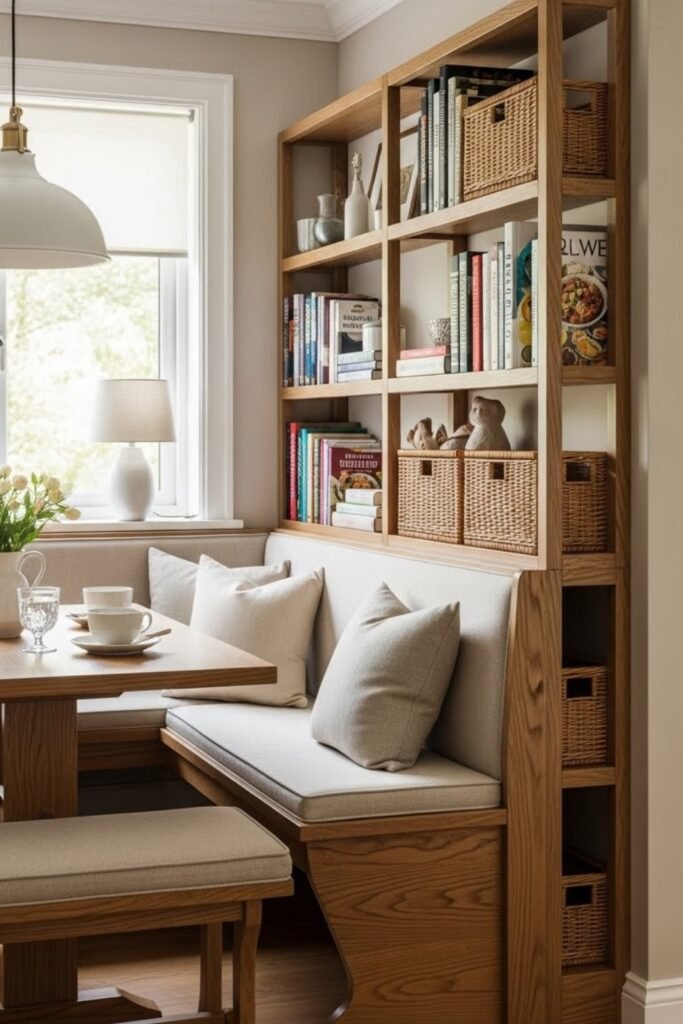 Design a breakfast nook with built-in shelving along one side of the bench. Open shelves can hold cookbooks, décor, or baskets.
