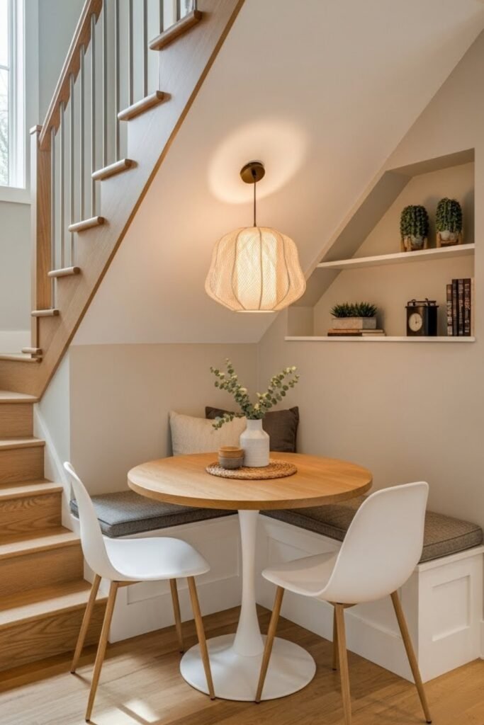 Use the space under a staircase to build a compact breakfast nook with a custom bench and small table.