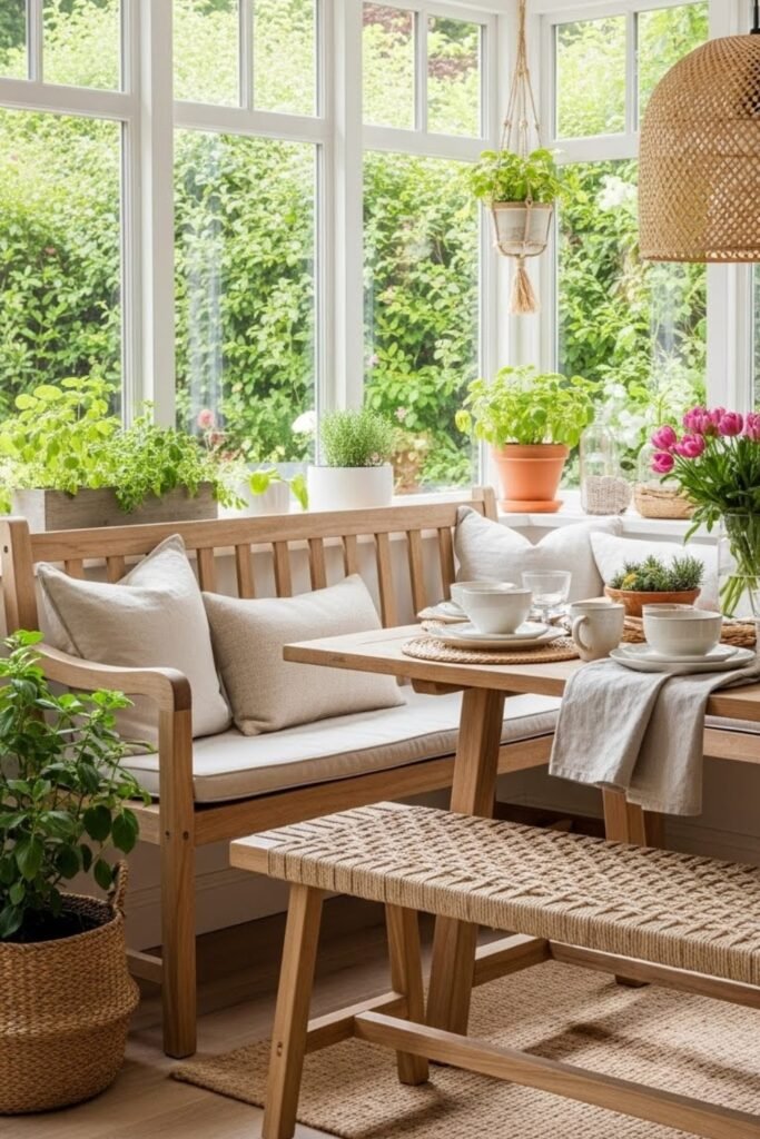 Design a breakfast nook that feels inspired by outdoor spaces using natural wood, simple benches, and plenty of light.