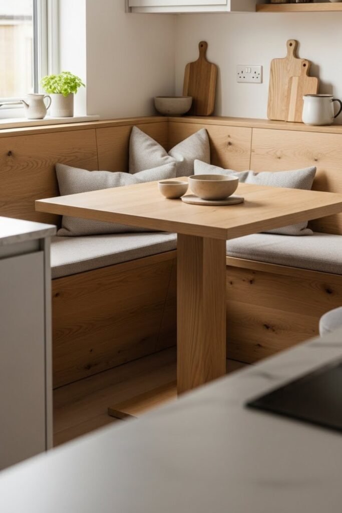 Build a breakfast nook using light wood tones and simple bench seating to create a relaxed coastal feel. Soft colors and natural textures keep the space bright and casual.