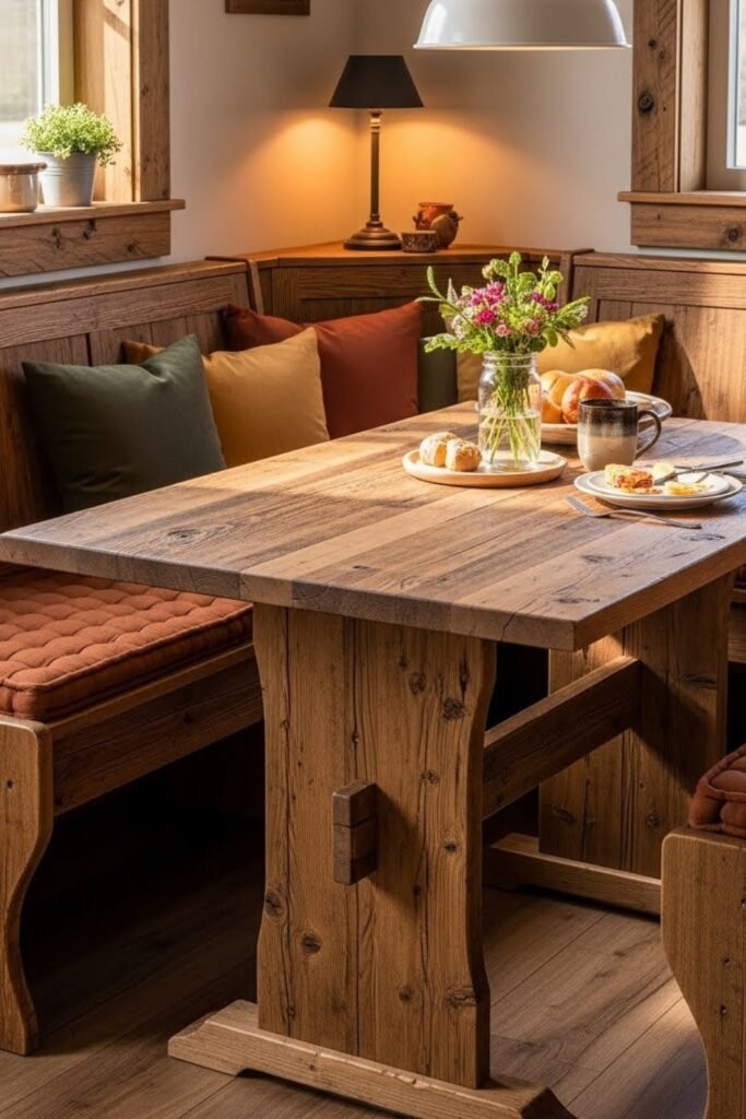Use reclaimed or rough-cut wood to build a rustic-style breakfast nook bench and table. The natural texture adds warmth and character to the space.