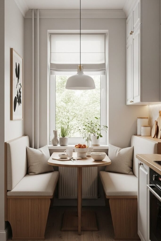 Keep colors neutral and finishes matte. This DIY idea creates a calm, airy nook that fits modern and minimalist kitchens perfectly.