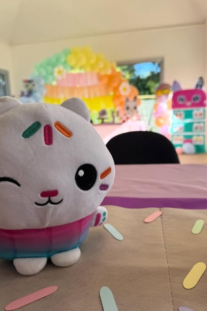 To make the room feel warm and inviting, use cuddly animals or character plushies as part of the decor and pair them with pastel backgrounds, balloons, or paper garlands.