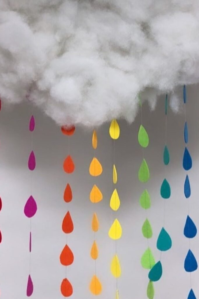 For the cloud, use cotton or polyfill. For the rains, hang colorful paper on thin string in a gradient pattern. The end product is bright but peaceful, which makes it great for art rooms, weather lectures, or displays that brighten your mood.