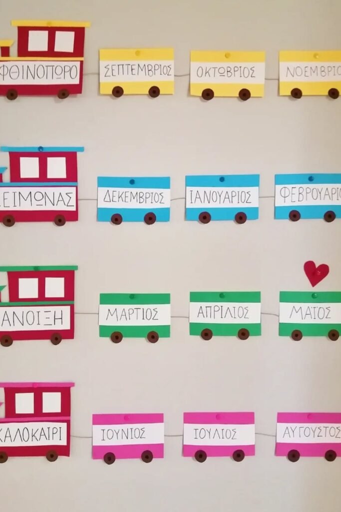This wall chart with a train theme makes learning about months and seasons more fun to look at. The colors of the train cars indicate the months in vivid, coordinated colors. Each train stands for a season.