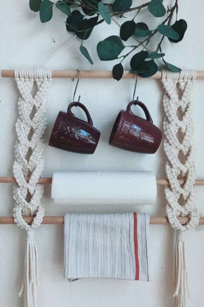Use strong dowels and cotton cord to make simple knot patterns, and then hang hooks for mugs or other things.
