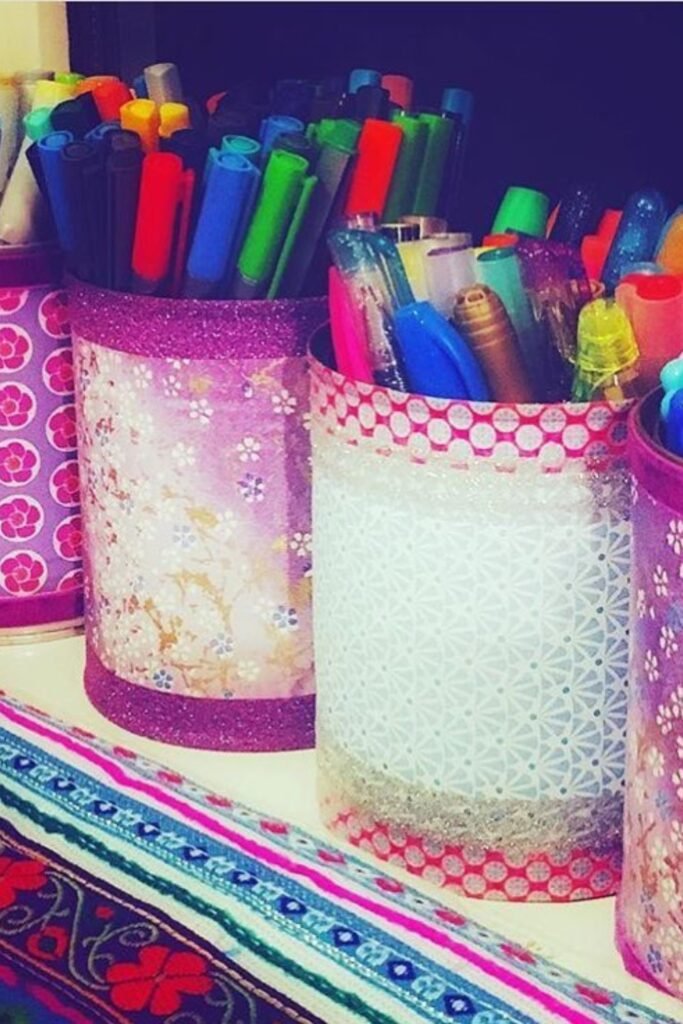 Make bright, patterned organizers for your classroom desk out of repurposed tin cans. Use scrapbook paper or washi tape with whimsical prints to cover each can. Then, for a more finished touch, add glitter tape to the edges.