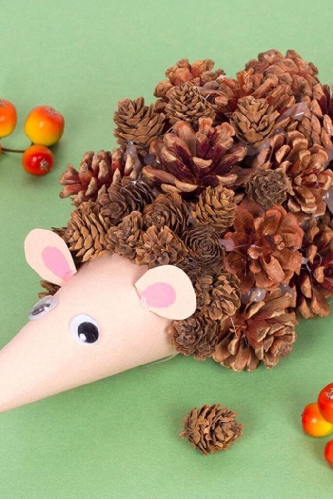 Make the face out of paper and glue on googly eyes and ears. Then, for the spiky body, add pinecones.