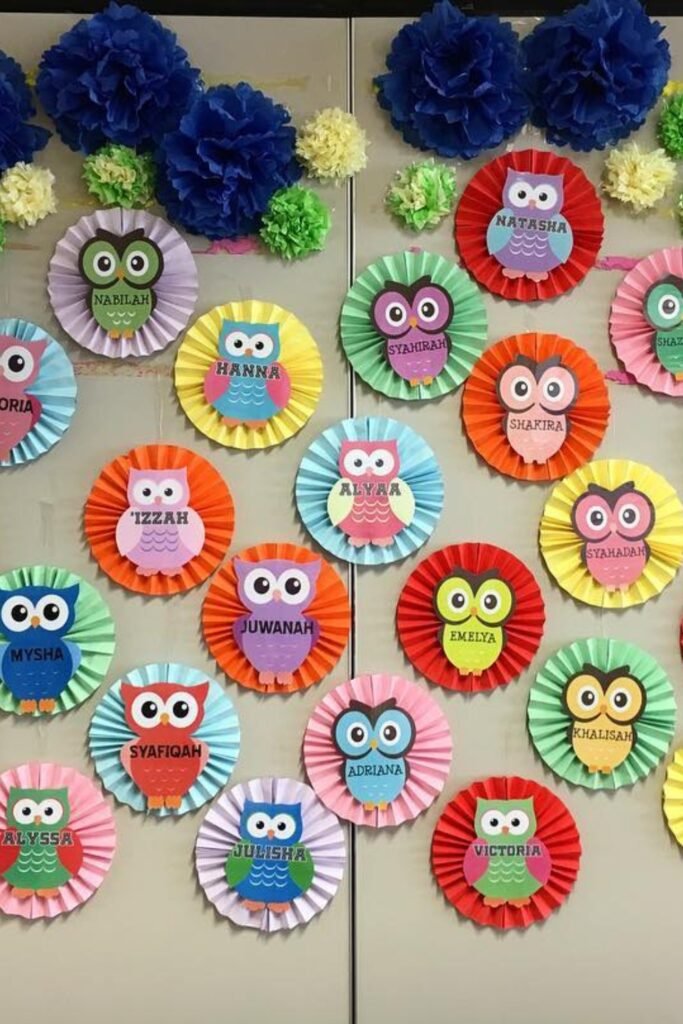 A paper rosette with a colorful owl cutout and the name of a pupil is on each one. Add some tissue paper pom-poms on top to make it look more festive.