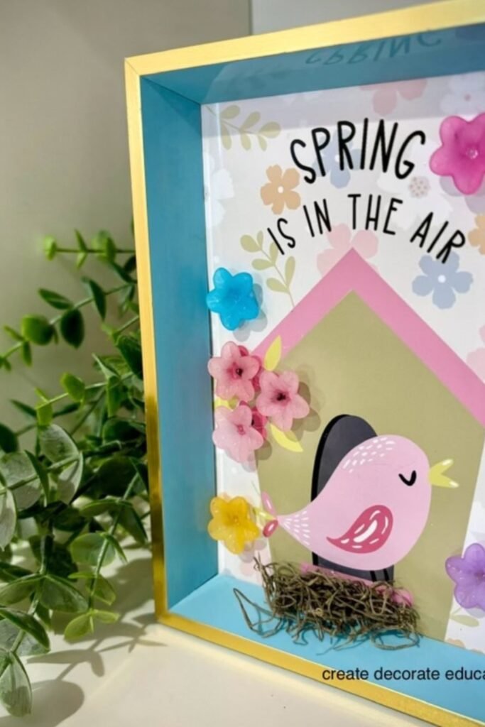 This cute spring shadow box will provide some seasonal brightness to your classroom. To add depth, use layered paper backdrops, pastel frames, and 3D flowers.
