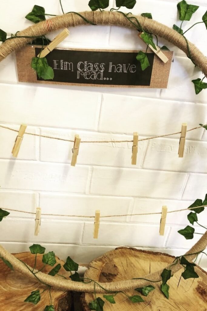 A fun method to keep track of how much your class is reading. Use jute rope to wrap a big embroidery hoop or hula hoop, and then weave fake vines around it to give it a natural look.