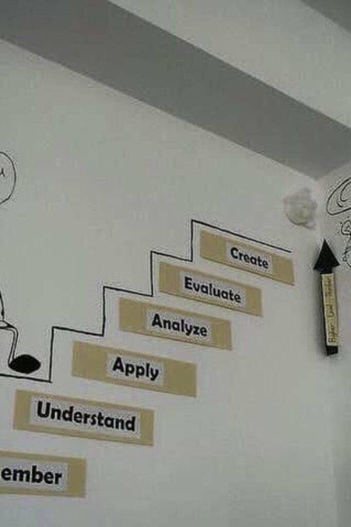 This imaginative “Bloom’s Taxonomy” stairway can turn your classroom wall into a step-by-step guide to learning. Remember, Understand, Apply, Analyze, Evaluate, and Create are all steps that help you remember how learning grows.