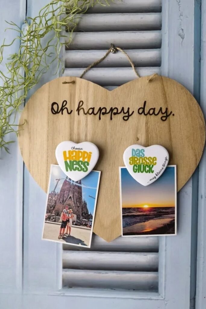 You may make a happy photo display out of a simple wooden heart. On top, write or stencil a positive slogan like “Oh happy day.” Then use magnets, clips, or little pins to hang up pictures, art, or recollections from class.