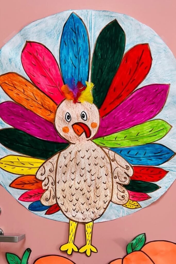 This happy turkey craft will make your classroom door look better. It’s great for Thanksgiving or fall themes.