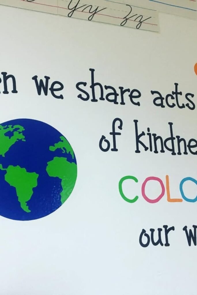 Write “When we share acts of kindness, we color our world” with vinyl letters or cut-up paper. Use rainbow colors to highlight important words like “color” to make them stand out.