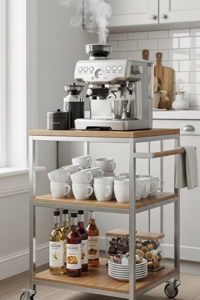 A rolling cart coffee bar is ideal for small homes or apartments. Use a metal or wood utility cart, place your coffee maker on top, and store mugs and syrups on lower shelves.
