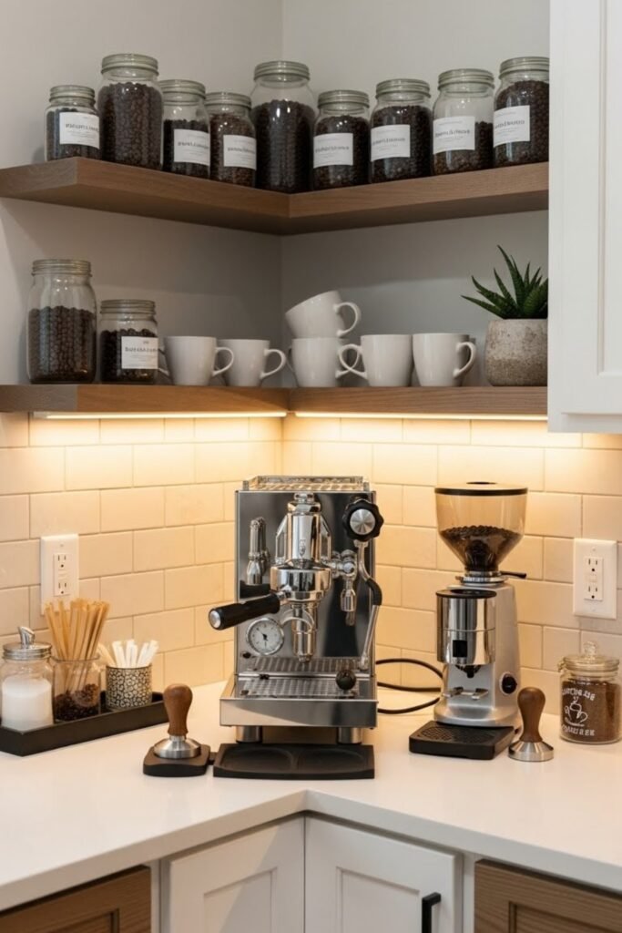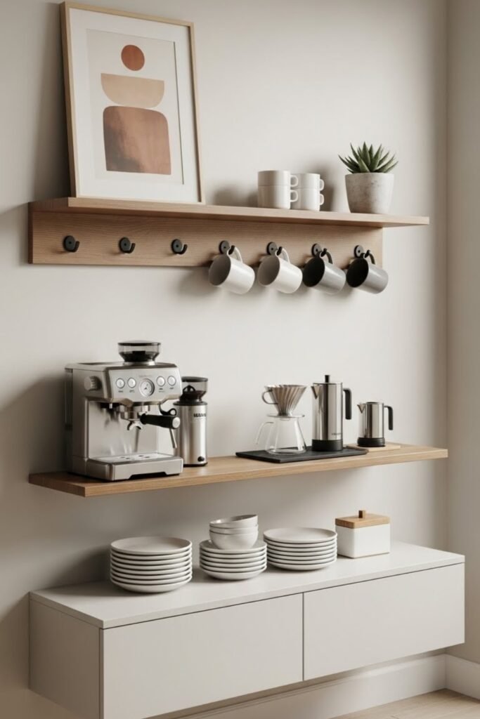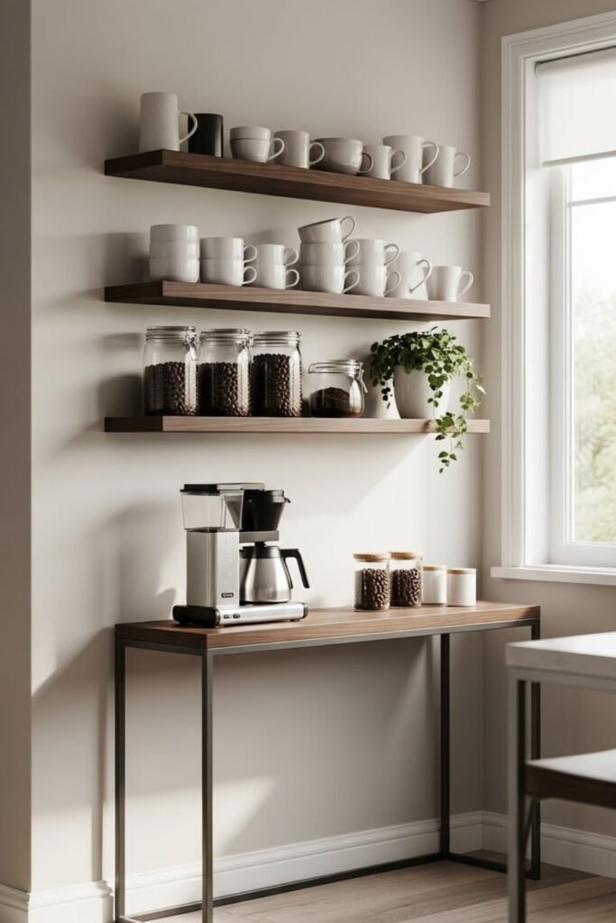 A floating shelf coffee bar saves floor space and looks clean. Mount two or three sturdy shelves on an empty wall, then place your coffee machine below on a small counter or console.