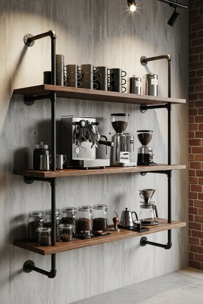 An industrial pipe coffee bar uses metal pipes and wood shelves for a bold, modern look. Mount the pipe frame to the wall and add wooden shelves for mugs and beans.