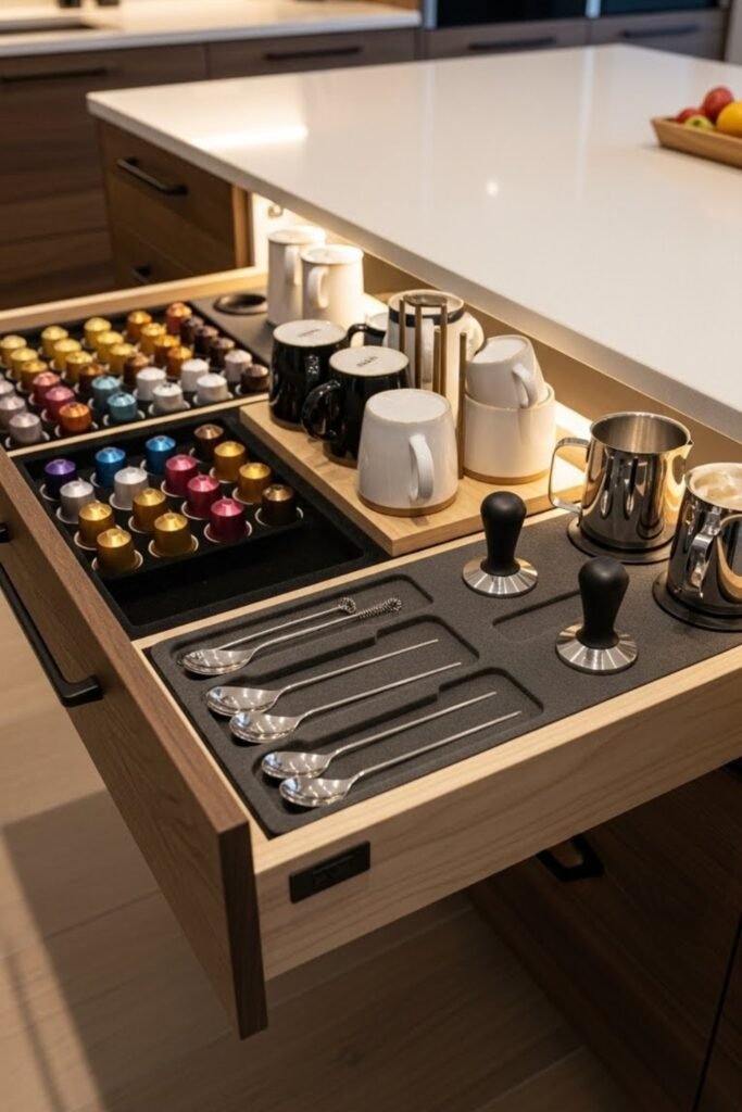This works best in custom kitchens or islands with deep drawers. It keeps counters clear and is ideal if you want a clean look without visible coffee clutter.