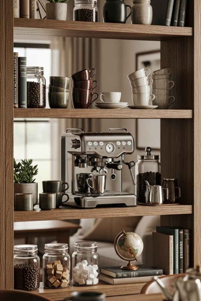 A bookshelf coffee bar turns open shelving into a functional station. Place your coffee maker on a middle shelf and use the others for mugs, jars, and decor.