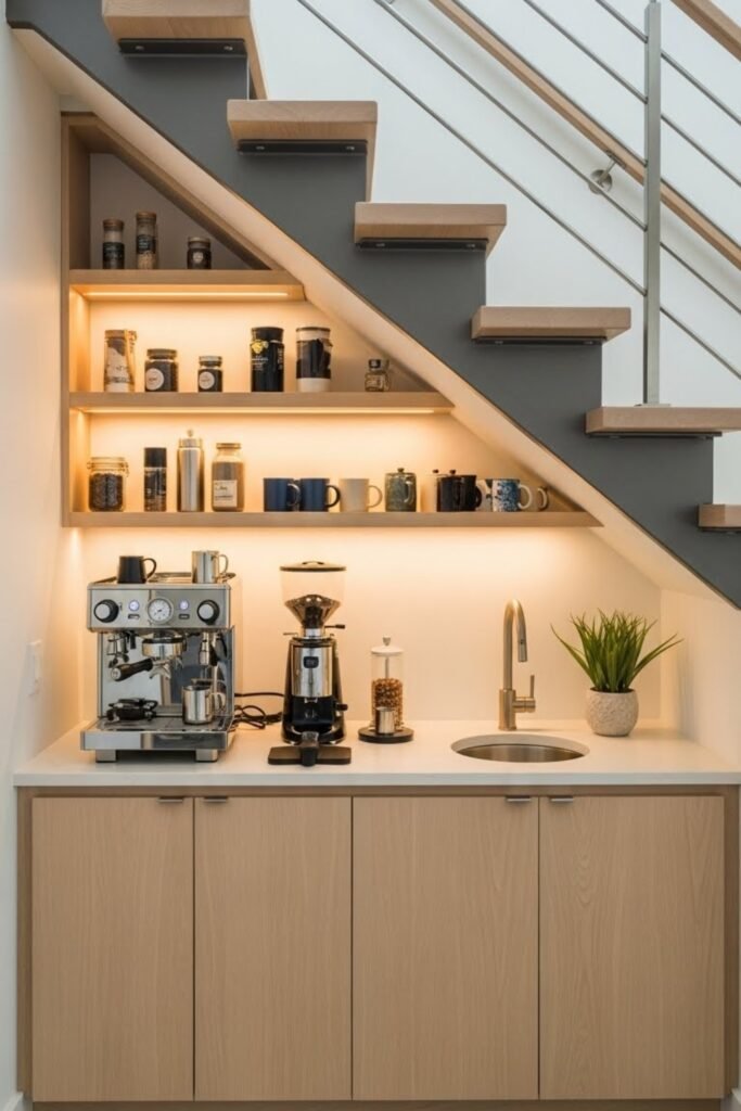 An under-stairs coffee bar uses hidden space creatively. Install a slim cabinet or shelves beneath the stairs and turn it into a cozy coffee station.