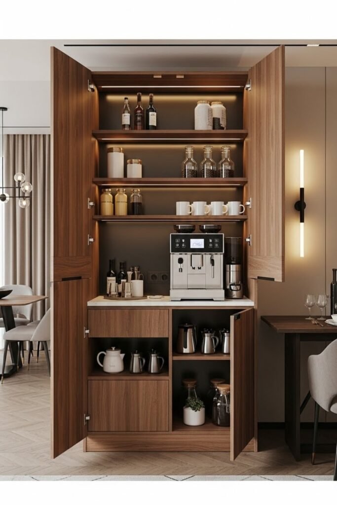 Turn an unused cabinet or pantry section into a hidden coffee bar. Remove the doors or keep them for a clean look. Add shelves for mugs, jars, and coffee tools.
