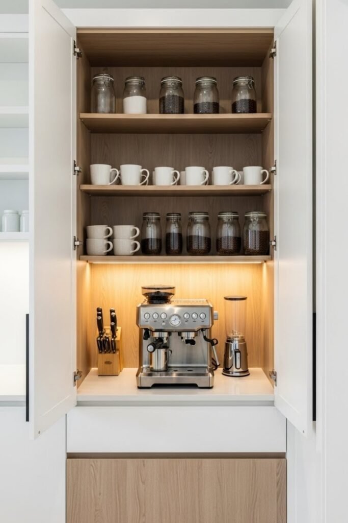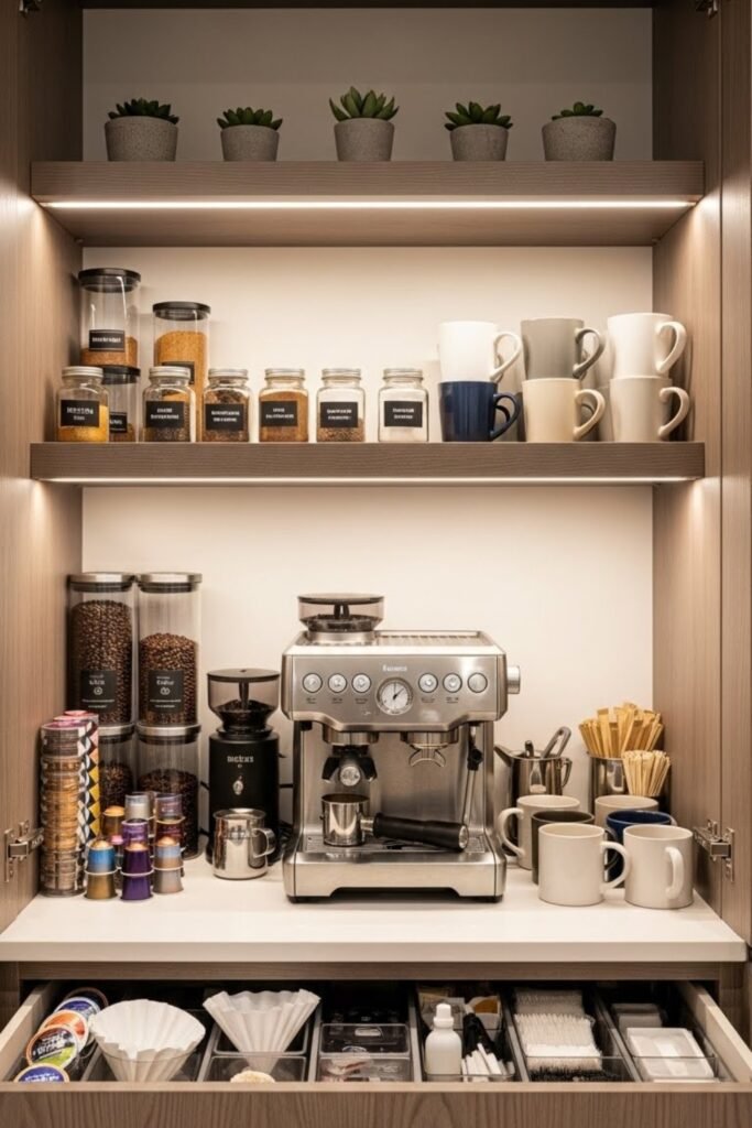 This idea works best in kitchens where counter space feels crowded. Everything stays organized while your coffee station blends seamlessly into existing cabinetry.