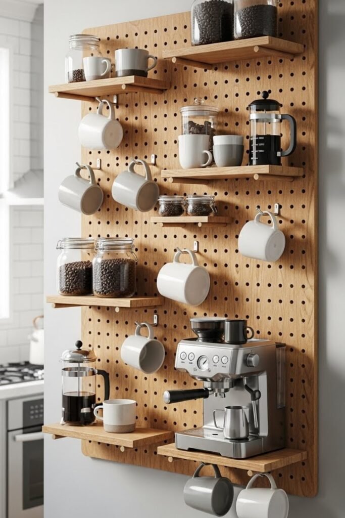 A pegboard coffee bar adds flexible storage to a small wall. Hang mugs, shelves, and baskets to customize the layout. This works great in kitchens, offices, or garages where wall space is available.