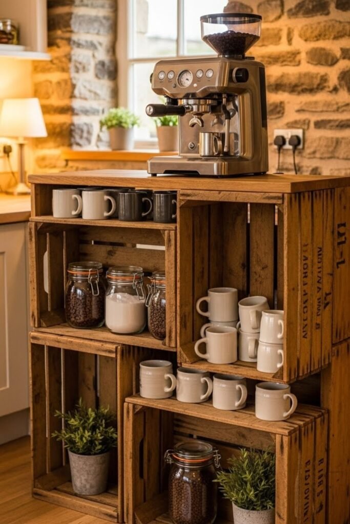 A crate coffee bar uses wooden crates stacked or mounted together. Use the top crate for the coffee machine and others for mugs or jars.
