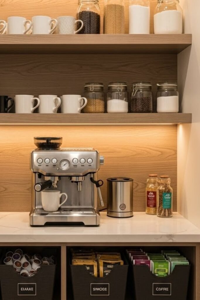 This idea works best in larger kitchens or pantries. It keeps your setup tidy while making coffee prep fast and easy every morning.