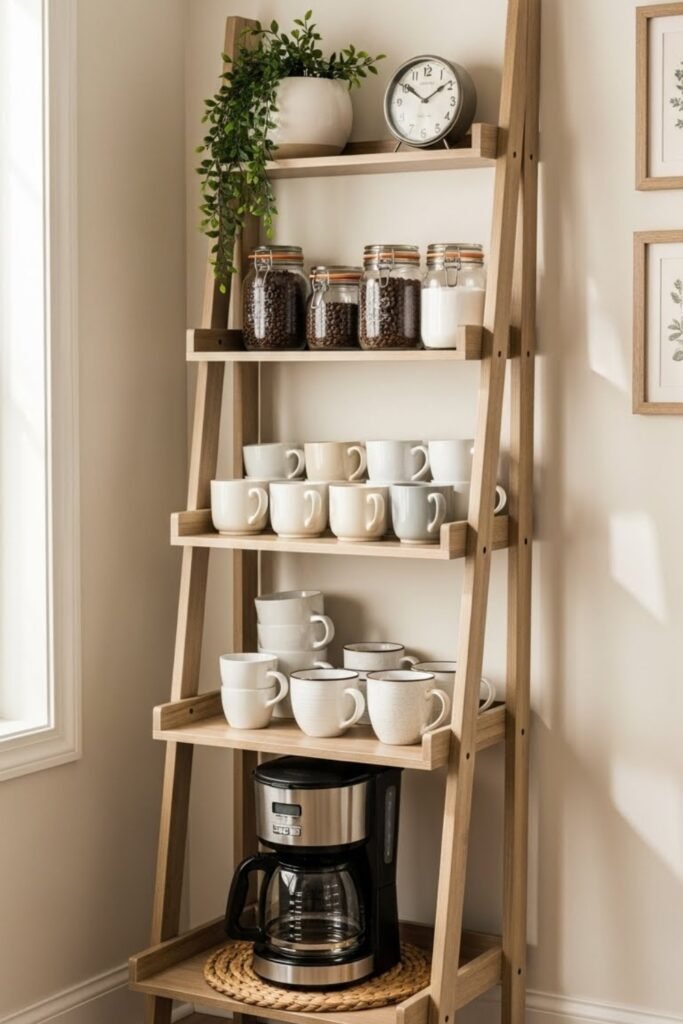 A ladder coffee bar uses a leaning ladder shelf to create vertical storage without heavy installation. Place your coffee maker on the bottom shelf and use upper shelves for mugs, jars, and decor.