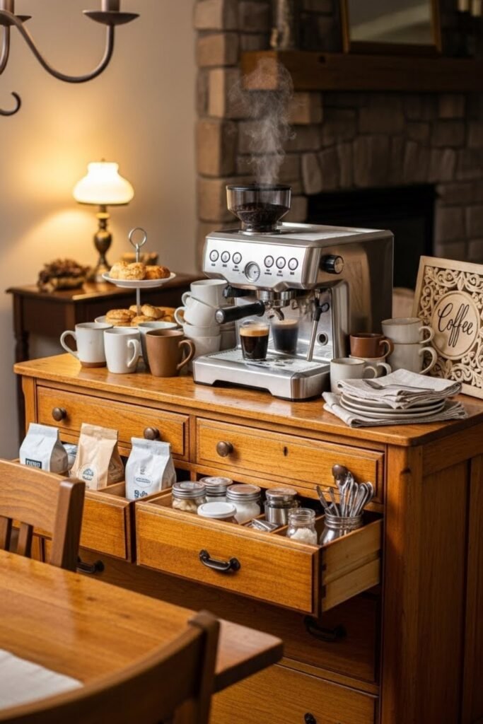 A vintage dresser coffee bar gives you deep storage and strong visual character. Remove the top drawers or use them to store pods, filters, and spoons.