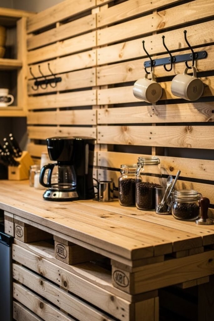 A pallet coffee bar works best if you want a rustic, budget-friendly setup. Use one or two sanded pallets, add a wood top, and mount simple hooks for mugs.