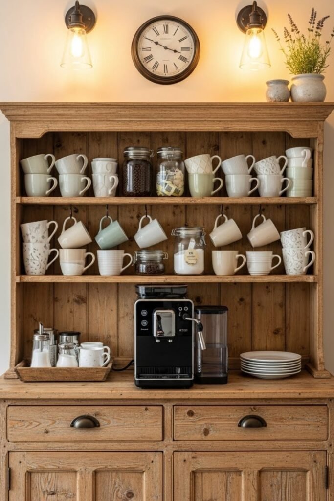 A hutch coffee bar offers built-in structure for mugs, jars, and coffee essentials. Use the upper shelves for display and the lower cabinet for storage.