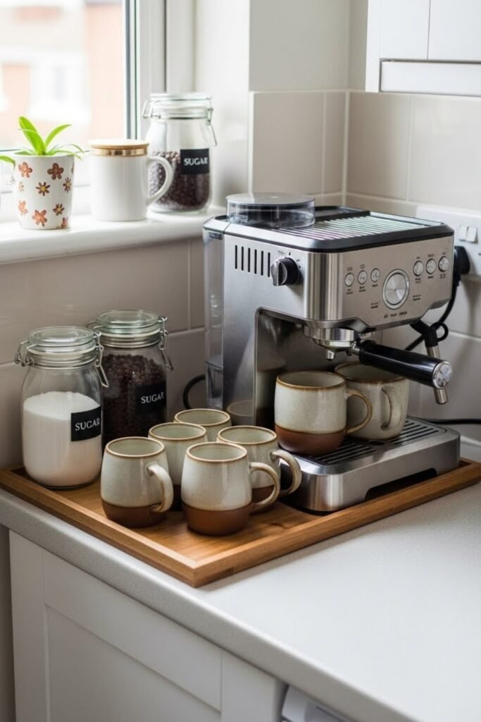 Add a tray to group mugs, sugar, and syrups so it feels intentional. This idea works well in small kitchens where adding furniture isn’t possible but you still want a defined coffee spot.