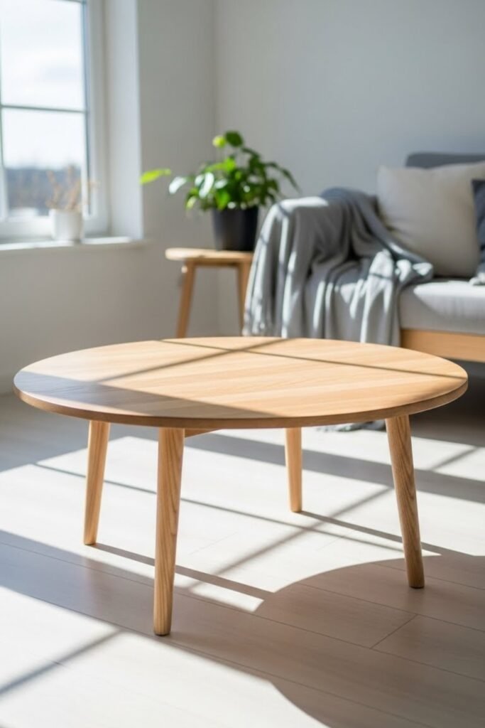 A round wood coffee table softens the layout of a living room. Cut a circular wood top and pair it with a pedestal or simple leg base.