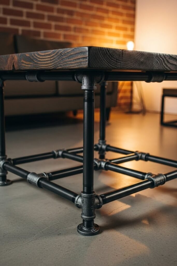 An industrial pipe coffee table uses metal plumbing pipes for the base and wood for the top. Assemble the pipe frame with threaded fittings, then attach a stained wood surface.