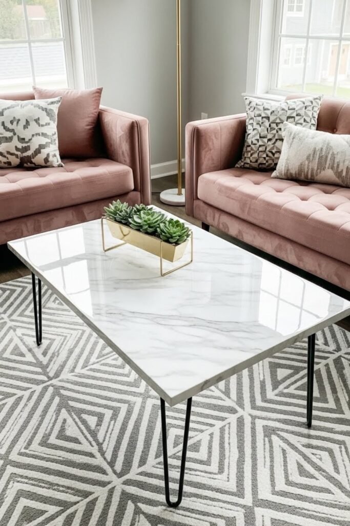 A marble-look coffee table gives a high-end feel without the cost. Use marble contact paper, faux marble laminate, or painted techniques on a wood top.