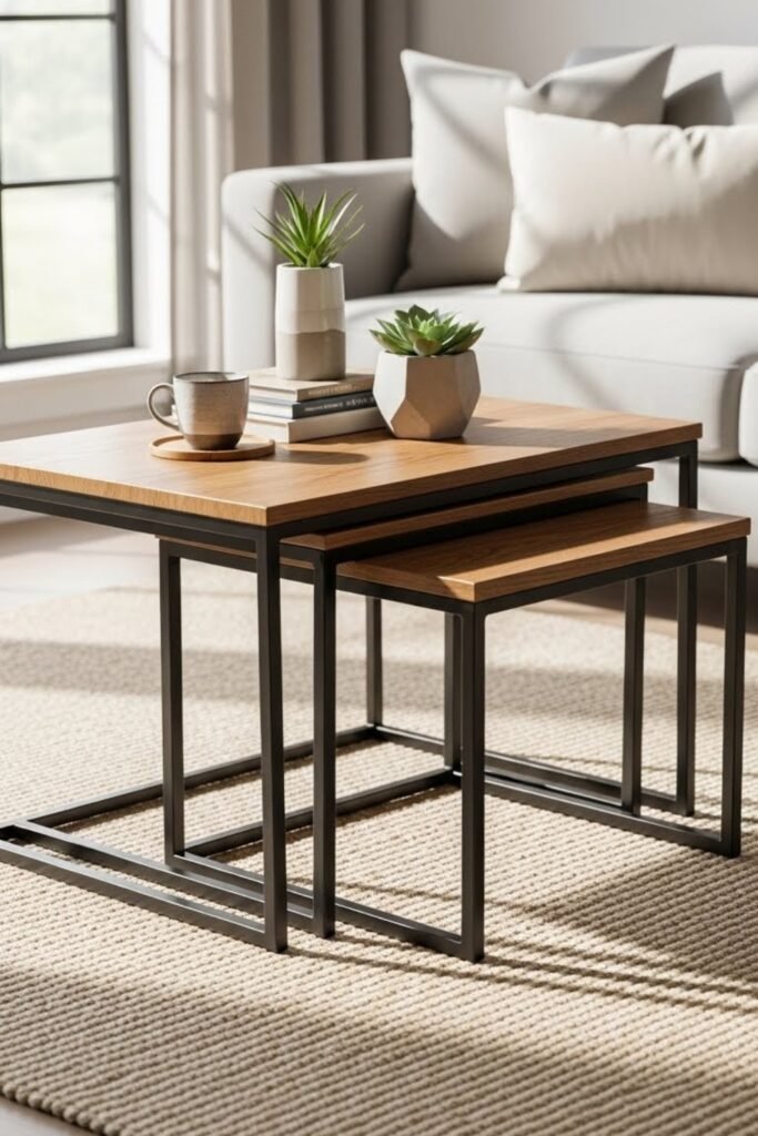 Nested coffee tables offer flexibility and style. Build two or three tables in different sizes that slide neatly together. Use matching materials so they look cohesive when separated or stacked.