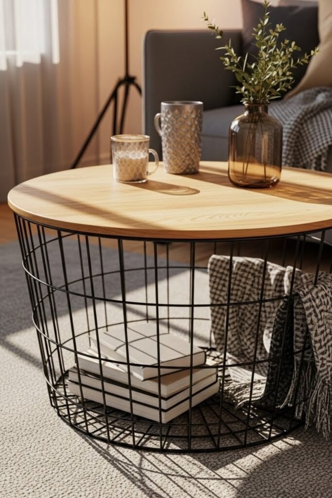 A wire basket coffee table combines storage with an airy look. Use a large metal basket as the base and secure a round or square wood top.