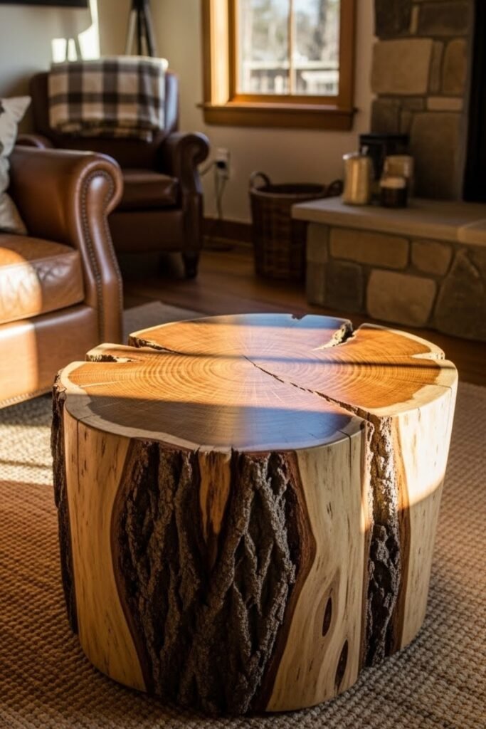 A tree stump coffee table adds a natural, organic element to your room. Use a solid wood stump, sand it smooth, and seal it properly.