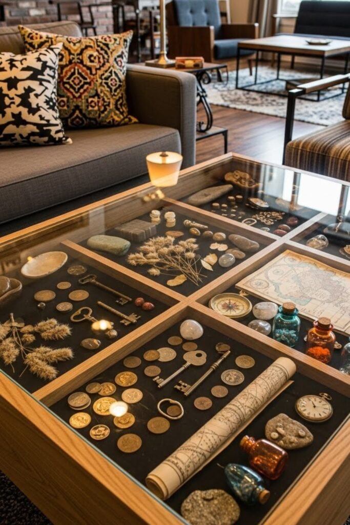 A shadow box coffee table lets you display decor under a glass top. Build a shallow wooden frame with compartments inside, then add a glass lid.