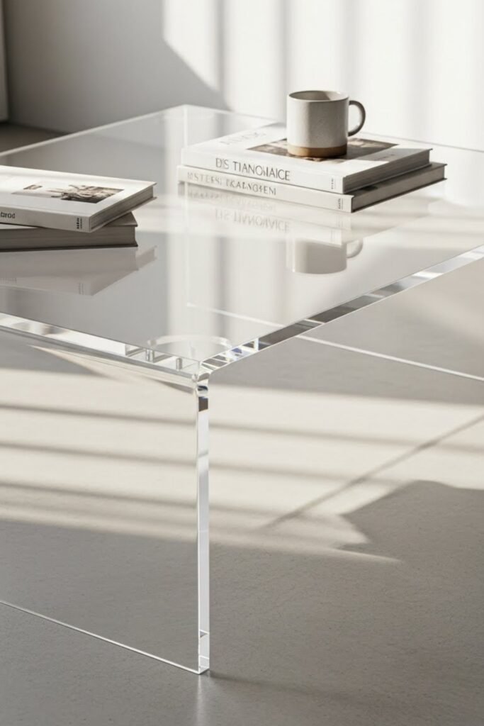 An acrylic coffee table creates a sleek, almost invisible look. Use clear acrylic panels cut to size and join them with strong adhesive or hardware.