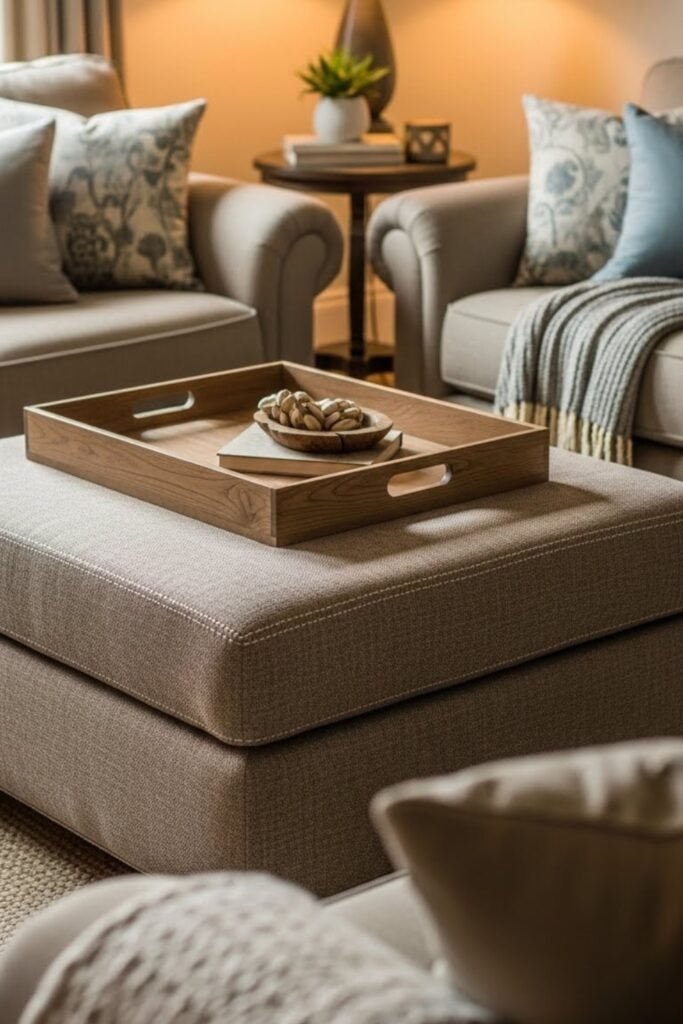 An ottoman coffee table blends comfort and function. Use a padded ottoman base and add a removable wood tray or fitted top.