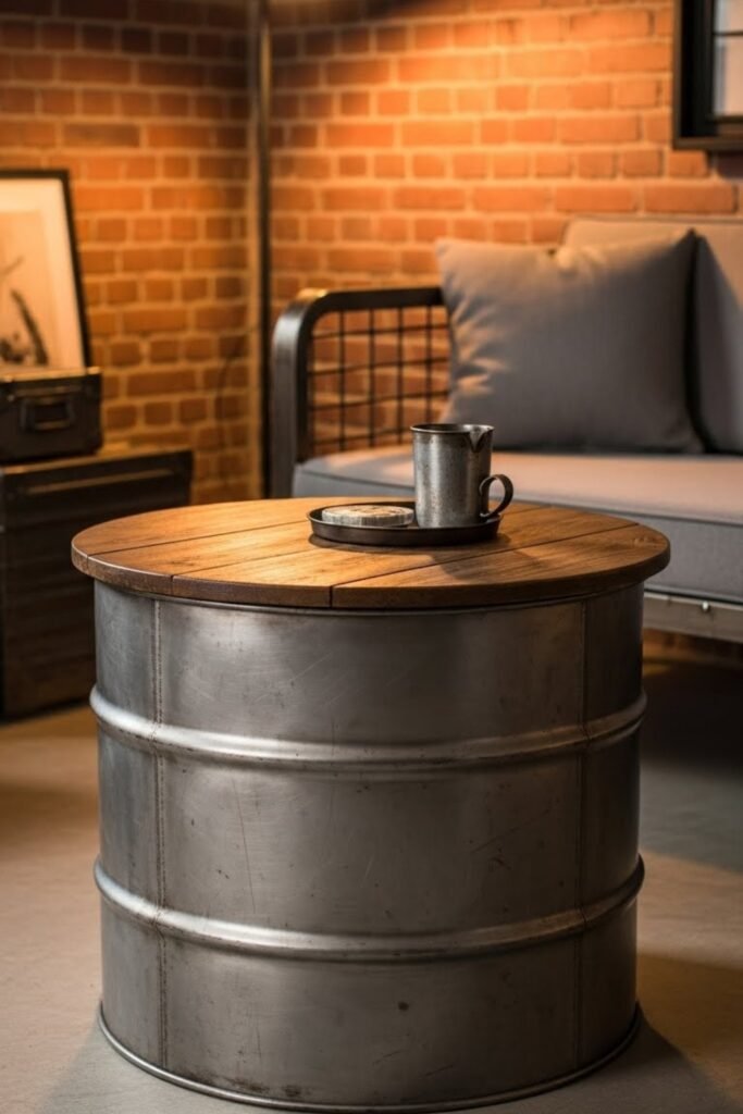 A drum coffee table repurposes a metal or wood drum into a unique base. Flip it upside down or add a wood top for stability.