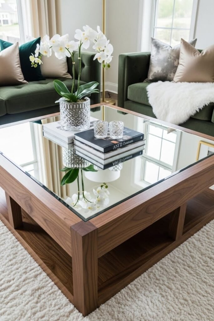 A mirror-top coffee table reflects light and makes the room feel larger. Install mirror panels or a single mirror sheet into a wood frame.